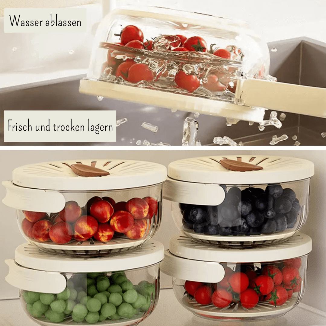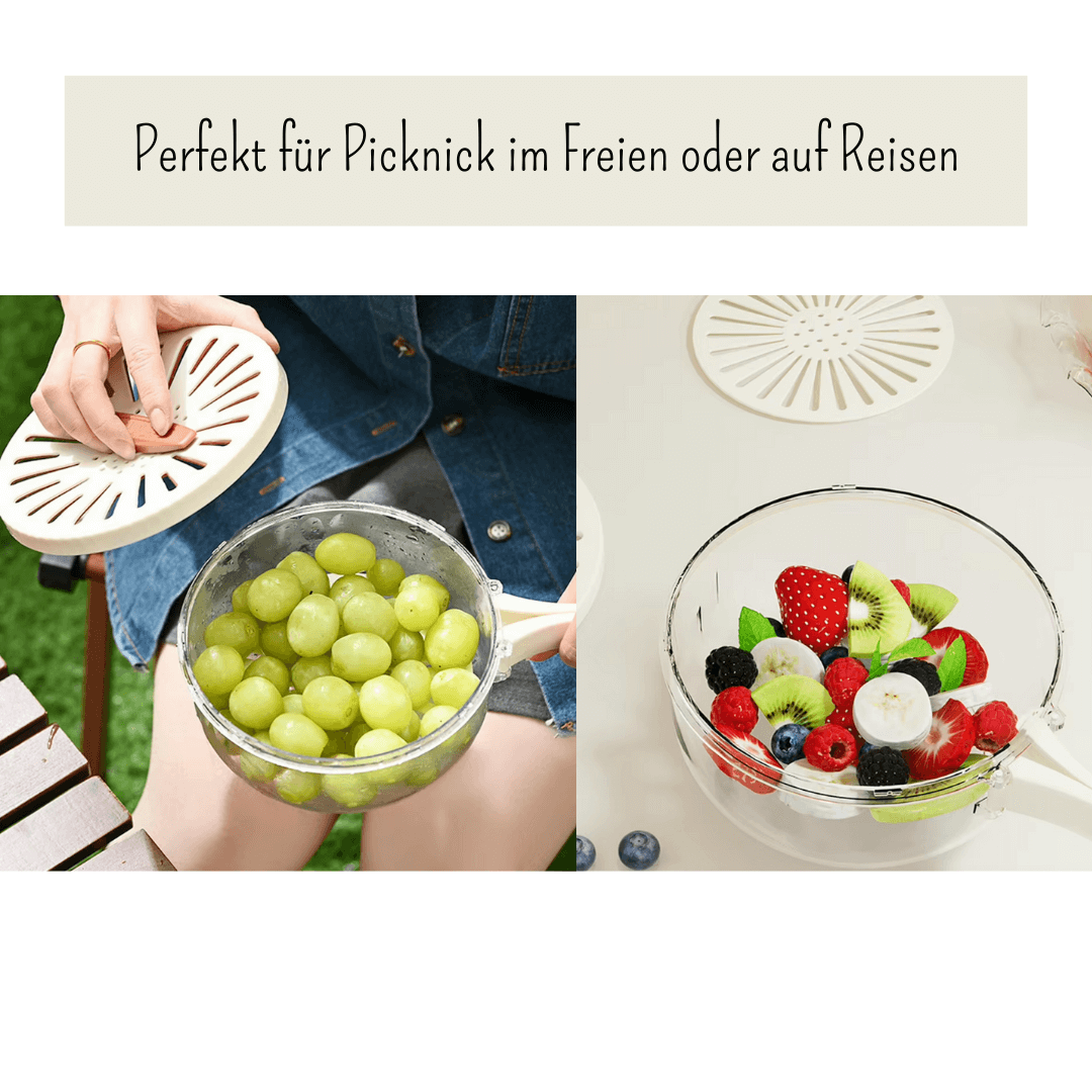 Mit der Abtropfschale kannst Du in wenigen Schritten Deine Lebensmittel, Waschen, Abtropfen und Aufbewahren. Mit dem ausklappbaren Griff kannst Du das gewaschene Obst oder Gemüse leicht halten und transportieren, zusätzlich benötigst du keine weiteren Behälter, denn es dient als Organizer für Deinen Kühlschrank. Dein Obst und Gemüse bleibt in der Abtropfschale frisch, da überschüssige Flüssigkeit in der Schale durch den Sieb durchfließen kann. Es besteht aus robusten Material und ist für den täglichen Gebrauch in Deiner der Küche, oder für Reisen entwickelt.