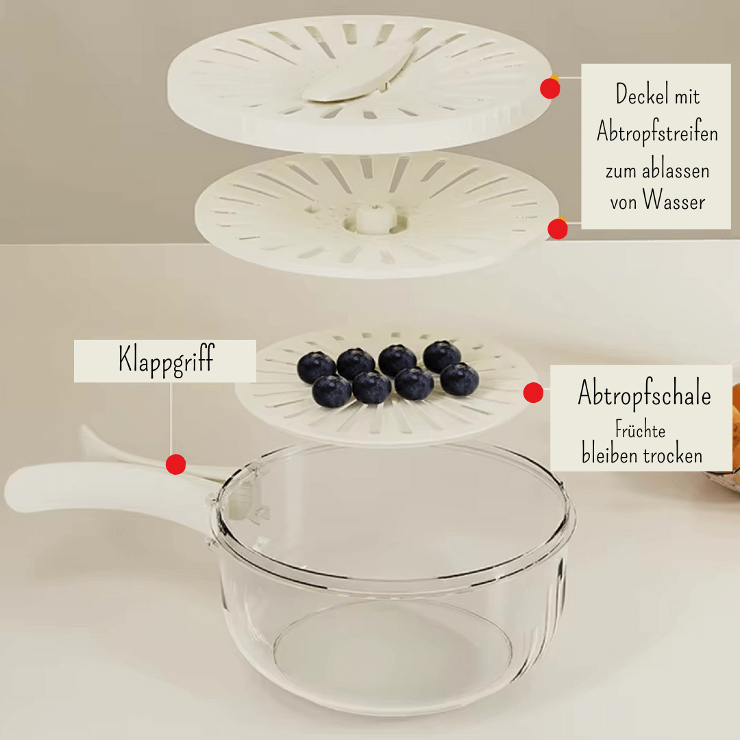 Die 3 in 1 Abtropfschale erleichtert Dir den Alltag, indem Du kostbare Zeit sparst.
